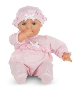 It will be love at first sight when this adorable, soft-bodied baby doll comes home! At 12 inches long, Jenna is the perfect size for toddlers 18 months and older to hug, cuddle, and care for. She has molded plastic hair and wipe-clean arms, legs and face. Jenna closes her bright blue eyes as she is rocked to sleep and when she lies down and opens them when she is picked up. Young mommies and daddies can comfort Jenna by helping her to suck her thumb or the included pacifier. Her beautifully stitched pink romper and matching infant bonnet are removable. Quality craftsmanship ensures endless hours of pretend play and a baby doll that will remain a favorite for years to come.